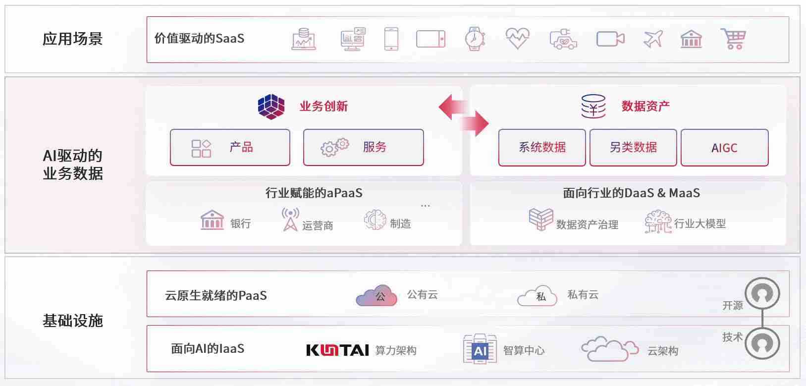 数字时代,,,,围绕企业数字化转型的关键要素,,,KY开元数码开创性的提出数云融合战略和技术体系框架,,,着力在云原生、、、、数字原生、、、AI原生和信创产业上架构产品和服务能力,,为处在不同数字化转型阶段的快消零售、、、汽车、、、、金融、、、、医疗、、政企、、、教育、、、、运营商等行业客户提供泛在的敏捷IT能力和融合的数据驱动能力,,,构建跨界融合创新的数字业务场景和新业务模式,,助力企业级客户建立面向未来的核心能力和竞争优势,,,,全面推动社会的数字化、、、智能化转型升级。。。